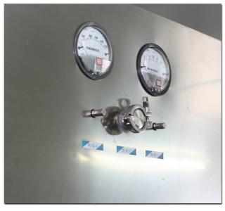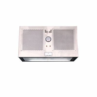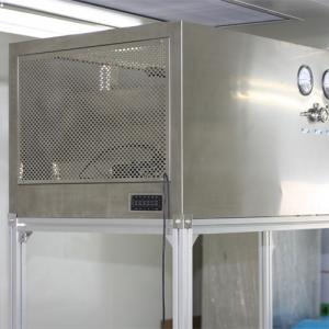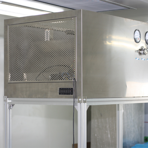 整體采用SUS304不銹鋼材料制作,利用大功率風(fēng)機或中央空調(diào)系統(tǒng)進行送回風(fēng),溫濕度控制較為方便。過濾器采用液槽密封形式,確保無泄漏。層流罩氣流為垂直單向流,出風(fēng)面可加裝均流膜,風(fēng)速在0.36-0.55m/s,可通過煙霧測試證明單向流狀態(tài)。層流罩上安裝PAO發(fā)塵口,PAO上游采樣口,可對每臺過濾器進行現(xiàn)場檢測。層流罩隔離裝置采用防靜電PC板或防靜電軟簾。