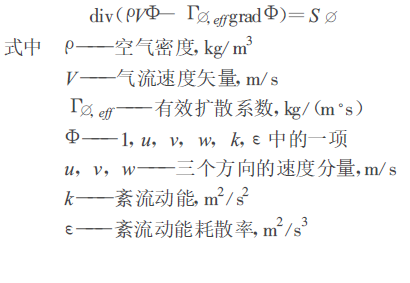 從流動的雷諾數來考慮, 潔凈車間的氣流均為紊流[ 1] , 空氣的流動滿足連續性方程、動量方程和能量方程。對于工程問題, 我們不需要關心紊流的精細結構及其瞬時變化, 而只關心紊流隨機變量的有關平均值, 因此, 本文采用雷諾時均方程紊流粘性系數法, 流動模型采用暖通空調廣泛采用的標準k -ε二方程模型, k -ε模型通過求解紊流動能與紊流動能耗散率的輸運方程得到紊流粘性系數。